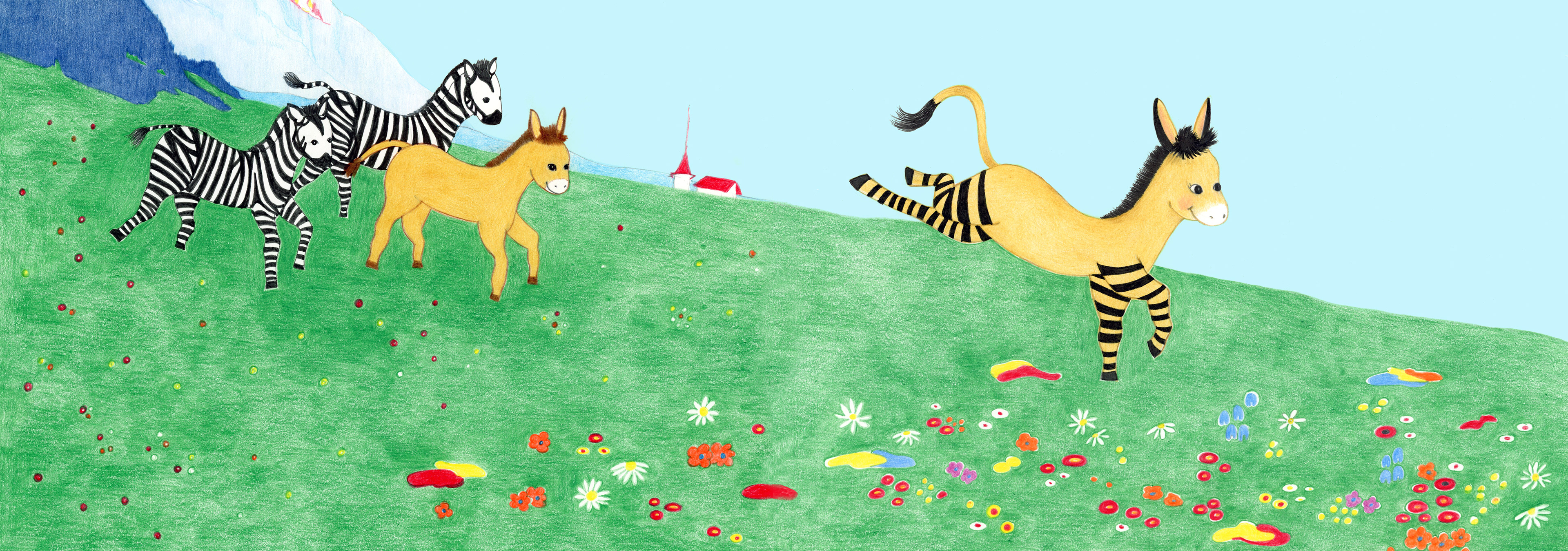 This is story about a Donkey and Zebras love and their child Zedonk. It is a tale about understanding and overcoming prejudice towards differences. I have combined print making with coloured pencil.